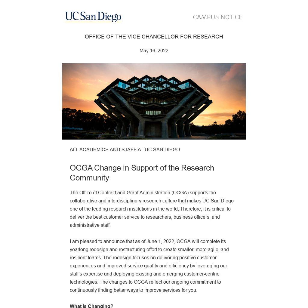 The Office of Contract and Grant Administration (OCGA) supports the collaborative and interdisciplinary research culture that makes UC San Diego one of the leading research institutions in the world. Therefore, it is critical to deliver the best customer service to researchers, business officers, and administrative staff.