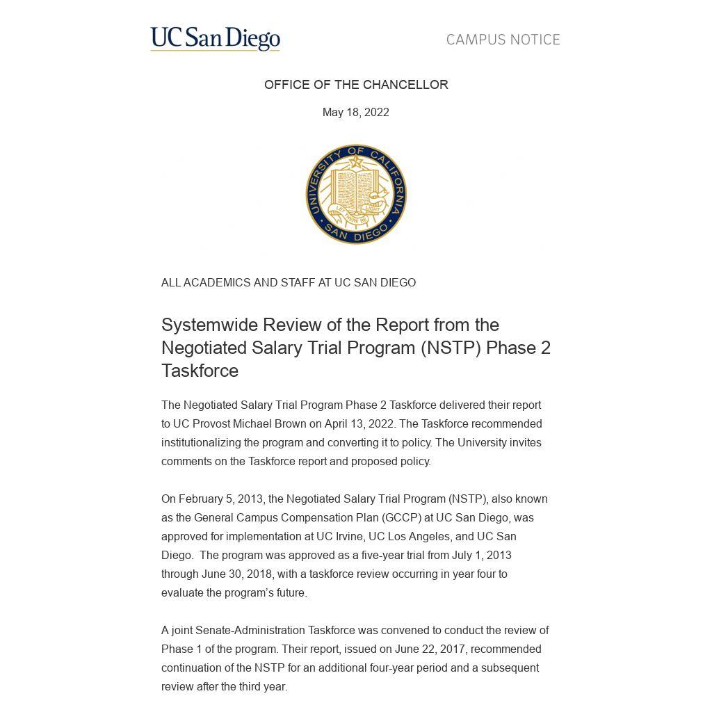 On February 5, 2013, the Negotiated Salary Trial Program (NSTP), also known as the General Campus Compensation Plan (GCCP) at UC San Diego, was approved for implementation at UC Irvine, UC Los Angeles, and UC San Diego. The program was approved as a five-year trial from July 1, 2013 through June 30, 2018, with a taskforce review occurring in year four to evaluate the program’s future.
