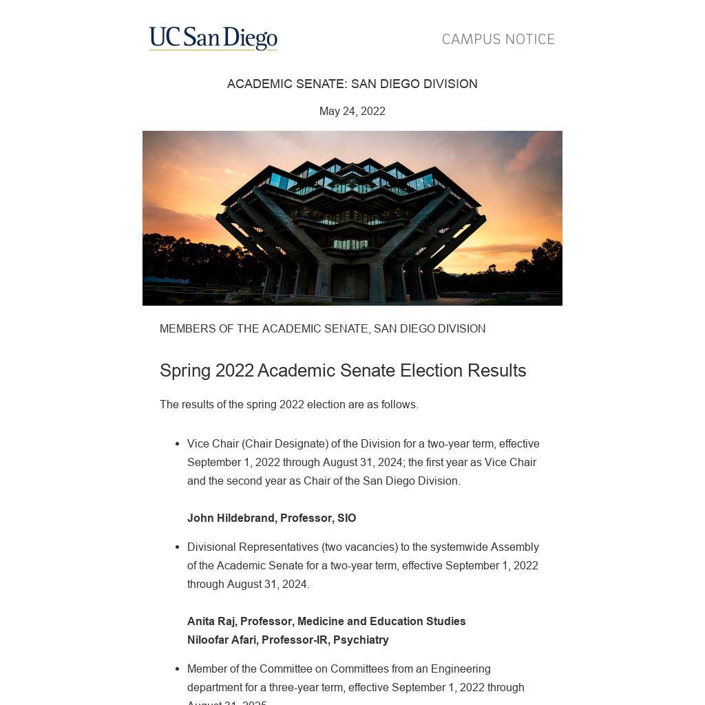 - Divisional Representatives (two vacancies) to the systemwide Assembly of the Academic Senate for a two-year term, effective September 1, 2022 through August 31, 2024.