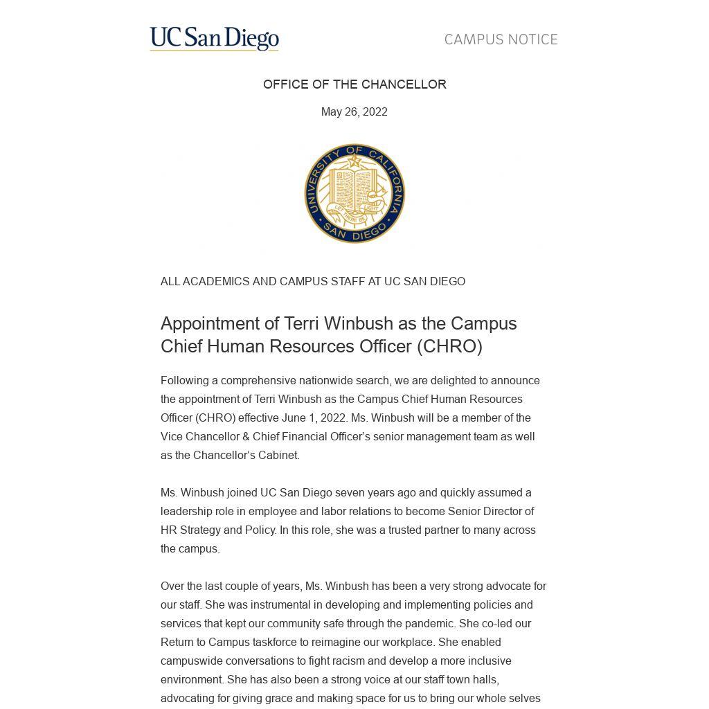 Following a comprehensive nationwide search, we are delighted to announce the appointment of Terri Winbush as the Campus Chief Human Resources Officer (CHRO) effective June 1, 2022. Ms. Winbush will be a member of the Vice Chancellor & Chief Financial Officer’s senior management team as well as the Chancellor’s Cabinet.