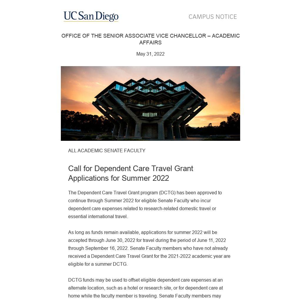 The Dependent Care Travel Grant program (DCTG) has been approved to continue through Summer 2022 for eligible Senate Faculty who incur dependent care expenses related to research-related domestic travel or essential international travel.