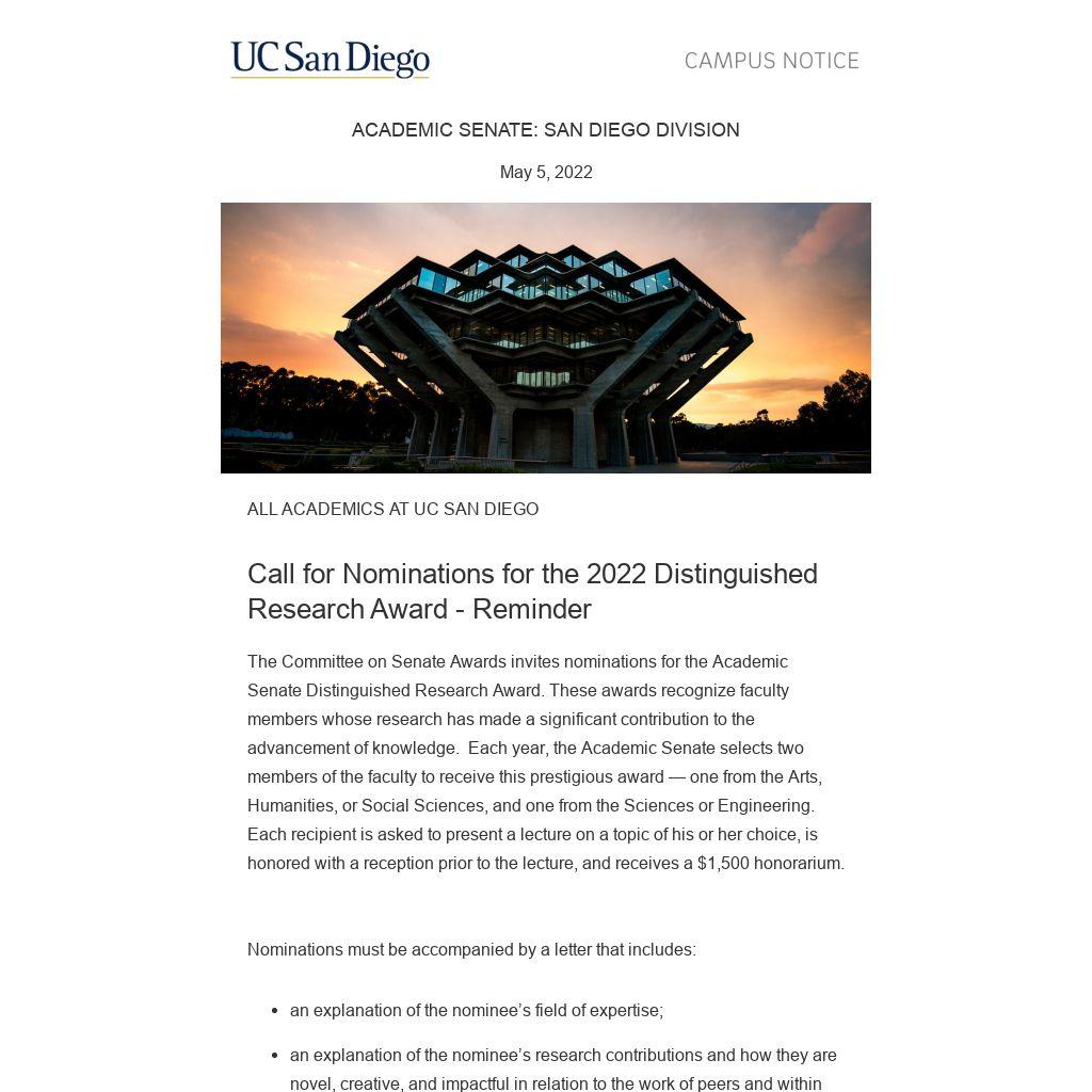 The Committee on Senate Awards invites nominations for the Academic Senate Distinguished Research Award. These awards recognize faculty members whose research has made a significant contribution to the advancement of knowledge. Each year, the Academic Senate selects two members of the faculty to receive this prestigious award — one from the Arts, Humanities, or Social Sciences, and one from the Sciences or Engineering. Each recipient is asked to present a lecture on a topic of his or her choice, is honored with a reception prior to the lecture, and receives a $1,500 honorarium.