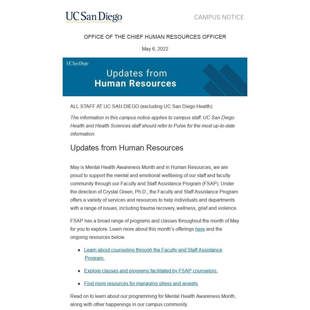 May is Mental Health Awareness Month and in Human Resources, we are proud to support the mental and emotional wellbeing of our staff and faculty community through our Faculty and Staff Assistance Program (FSAP). Under the direction of Crystal Green, Ph.D., the Faculty and Staff Assistance Program offers a variety of services and resources to help individuals and departments with a range of issues, including trauma recovery, wellness, grief and violence.