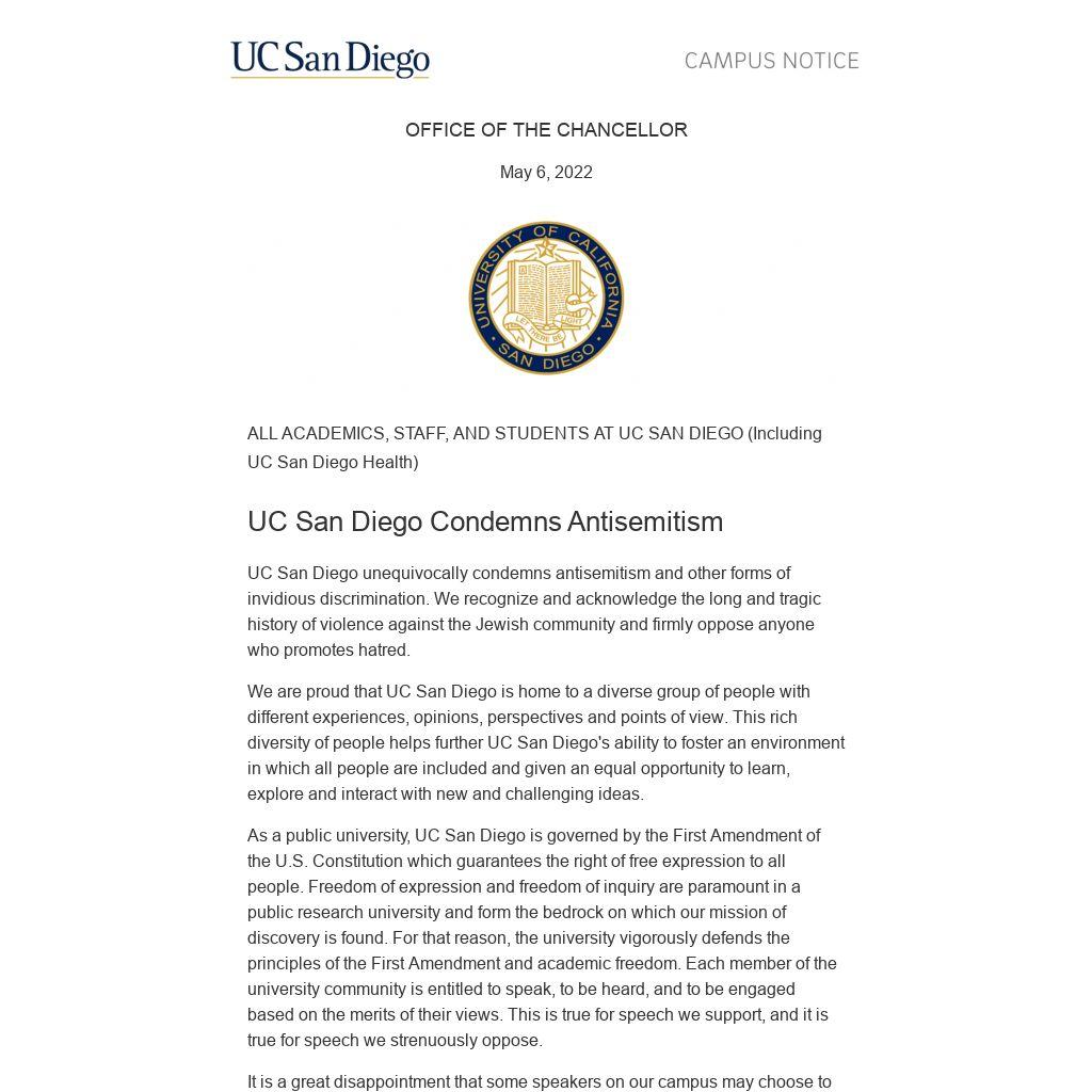 UC San Diego unequivocally condemns antisemitism and other forms of invidious discrimination. We recognize and acknowledge the long and tragic history of violence against the Jewish community and firmly oppose anyone who promotes hatred.