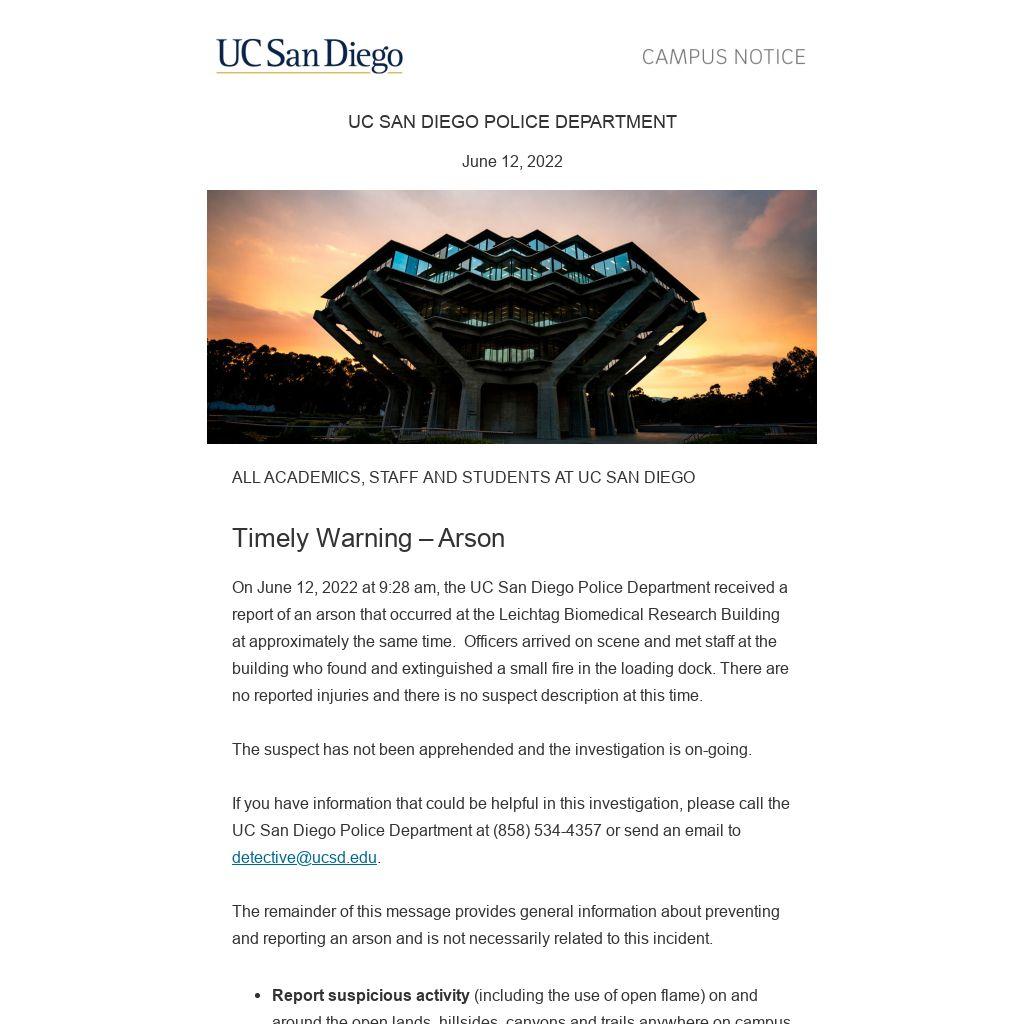 This notice is being provided to you to comply with the Jeanne Clery Disclosure of Campus Security Policy and Campus Crime Statistics Act. Timely Warnings are intended to prevent similar crimes and to provide information that will assist community members in protecting themselves.