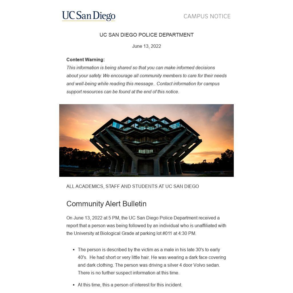 On June 13, 2022 at 5 PM, the UC San Diego Police Department received a report that a person was being followed by an individual who is unaffiliated with the University at Biological Grade at parking lot #011 at 4:30 PM.