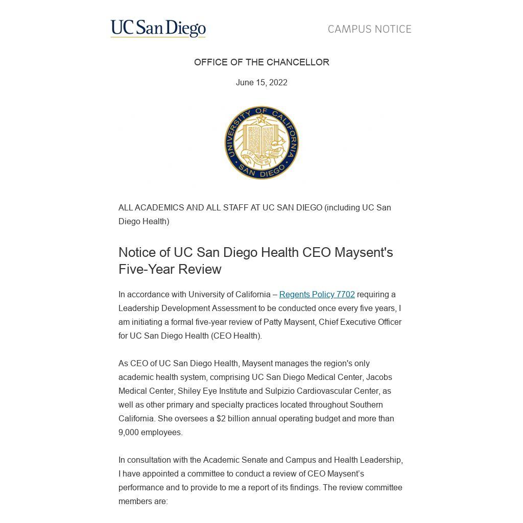 Notice of UC San Diego Health CEO Maysent's Five-Year Review | |