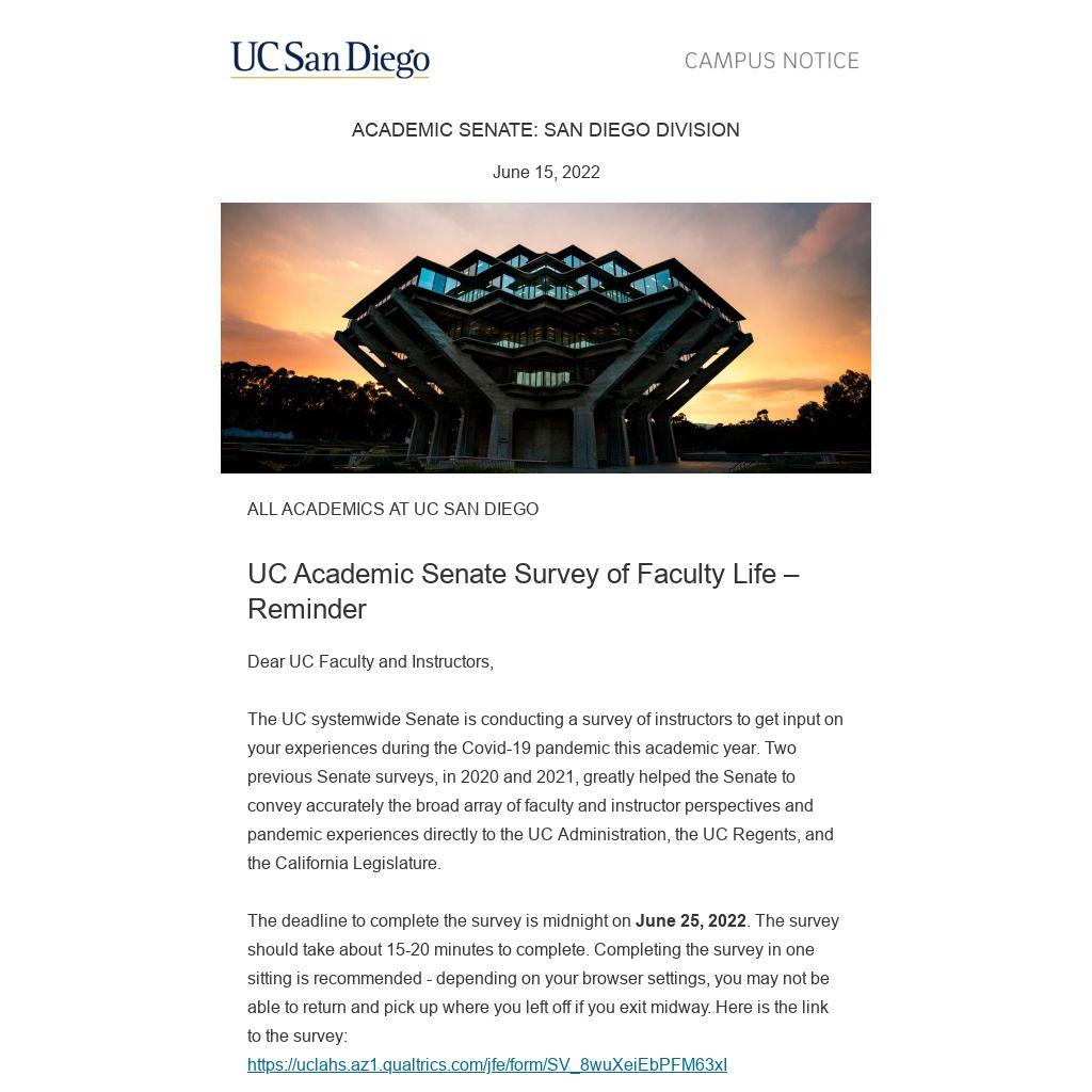 The UC systemwide Senate is conducting a survey of instructors to get input on your experiences during the Covid-19 pandemic this academic year. Two previous Senate surveys, in 2020 and 2021, greatly helped the Senate to convey accurately the broad array of faculty and instructor perspectives and pandemic experiences directly to the UC Administration, the UC Regents, and the California Legislature.
