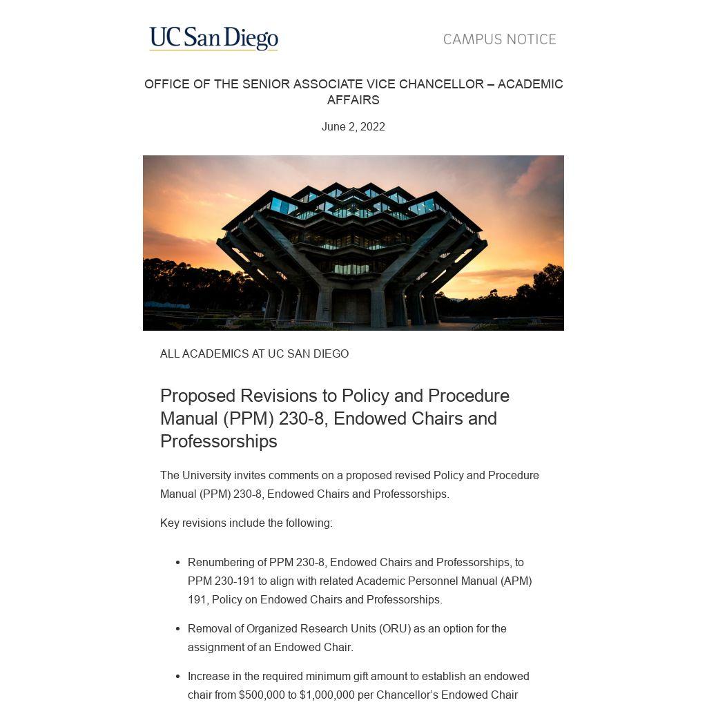 The University invites comments on a proposed revised Policy and Procedure Manual (PPM) 230-8, Endowed Chairs and Professorships.