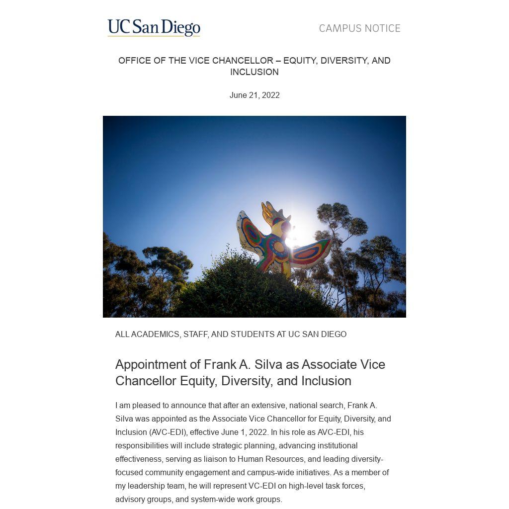 I am pleased to announce that after an extensive, national search, Frank A. Silva was appointed as the Associate Vice Chancellor for Equity, Diversity, and Inclusion (AVC-EDI), effective June 1, 2022. In his role as AVC-EDI, his responsibilities will include strategic planning, advancing institutional effectiveness, serving as liaison to Human Resources, and leading diversity-focused community engagement and campus-wide initiatives. As a member of my leadership team, he will represent VC-EDI on high-level task forces, advisory groups, and system-wide work groups.