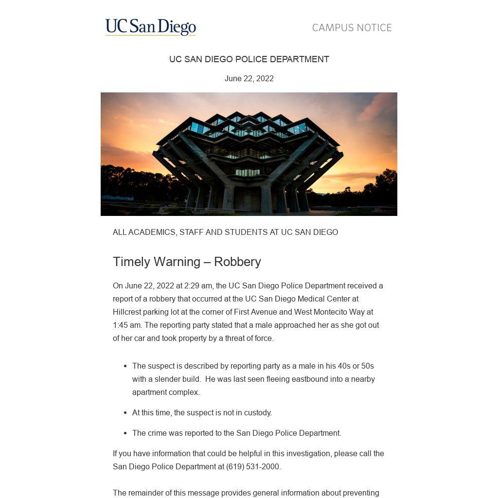 On June 22, 2022 at 2:29 am, the UC San Diego Police Department received a report of a robbery that occurred at the UC San Diego Medical Center at Hillcrest parking lot at the corner of First Avenue and West Montecito Way at 1:45 am. The reporting party stated that a male approached her as she got out of her car and took property by a threat of force.