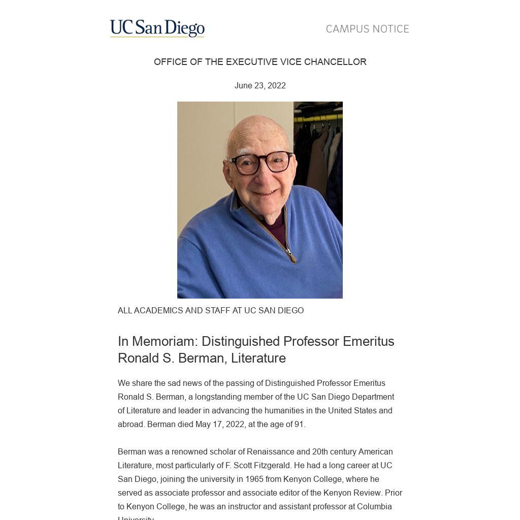 In Memoriam: Distinguished Professor Emeritus Ronald S. Berman, Literature | |