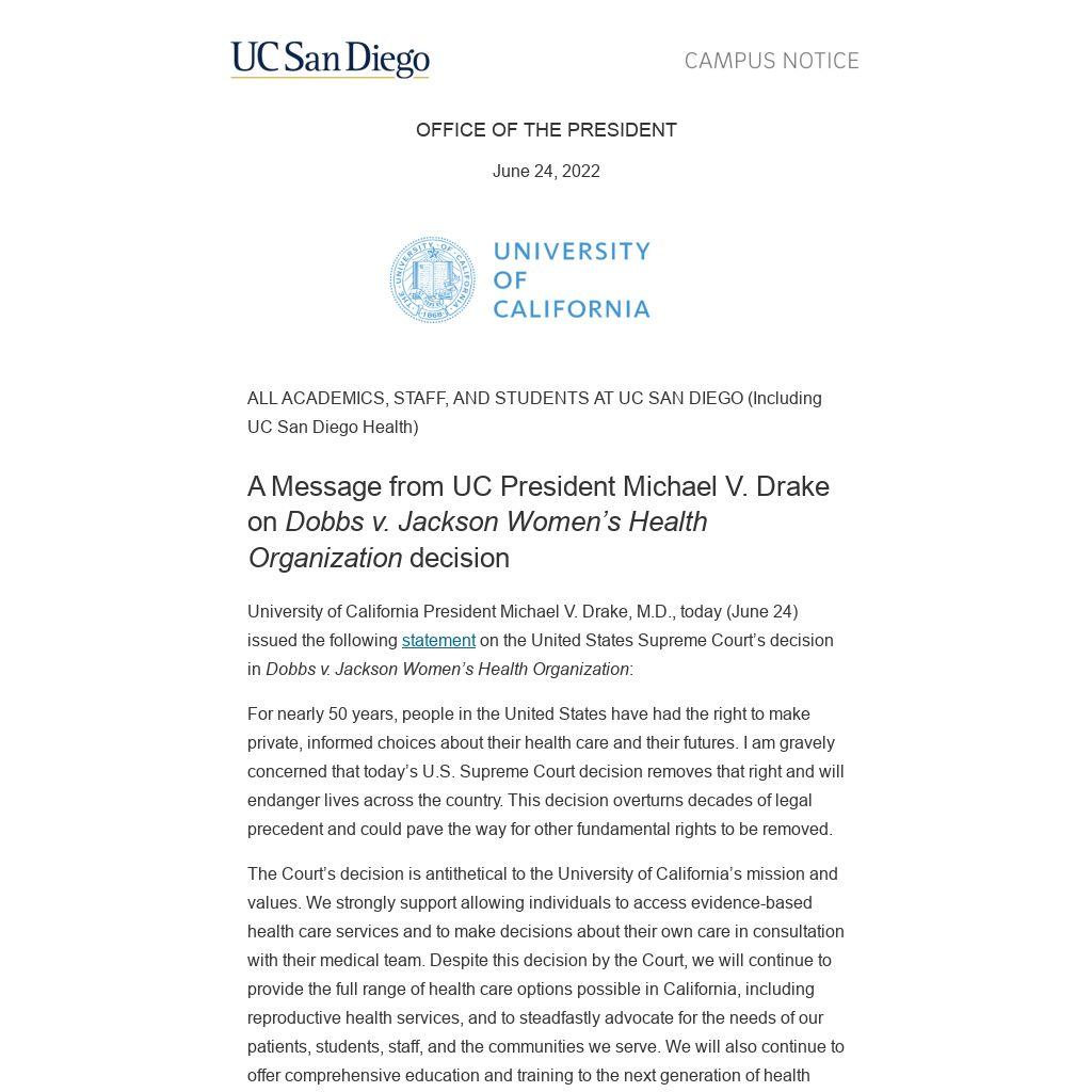 University of California President Michael V. Drake, M.D., today (June 24) issued the following statement on the United States Supreme Court’s decision in Dobbs v. Jackson Women’s Health Organization: