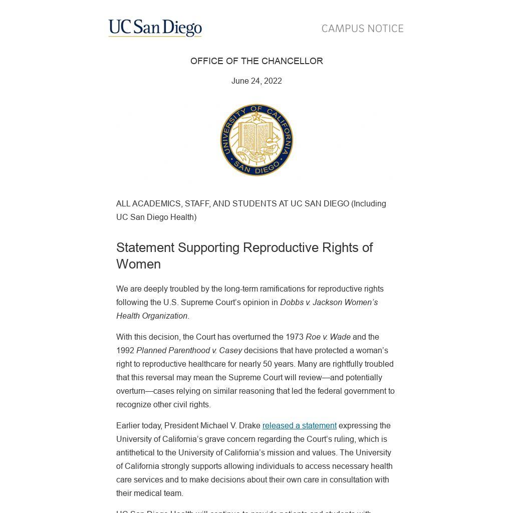 Earlier today, President Michael V. Drake released a statement expressing the University of California’s grave concern regarding the Court’s ruling, which is antithetical to the University of California’s mission and values. The University of California strongly supports allowing individuals to access necessary health care services and to make decisions about their own care in consultation with their medical team.