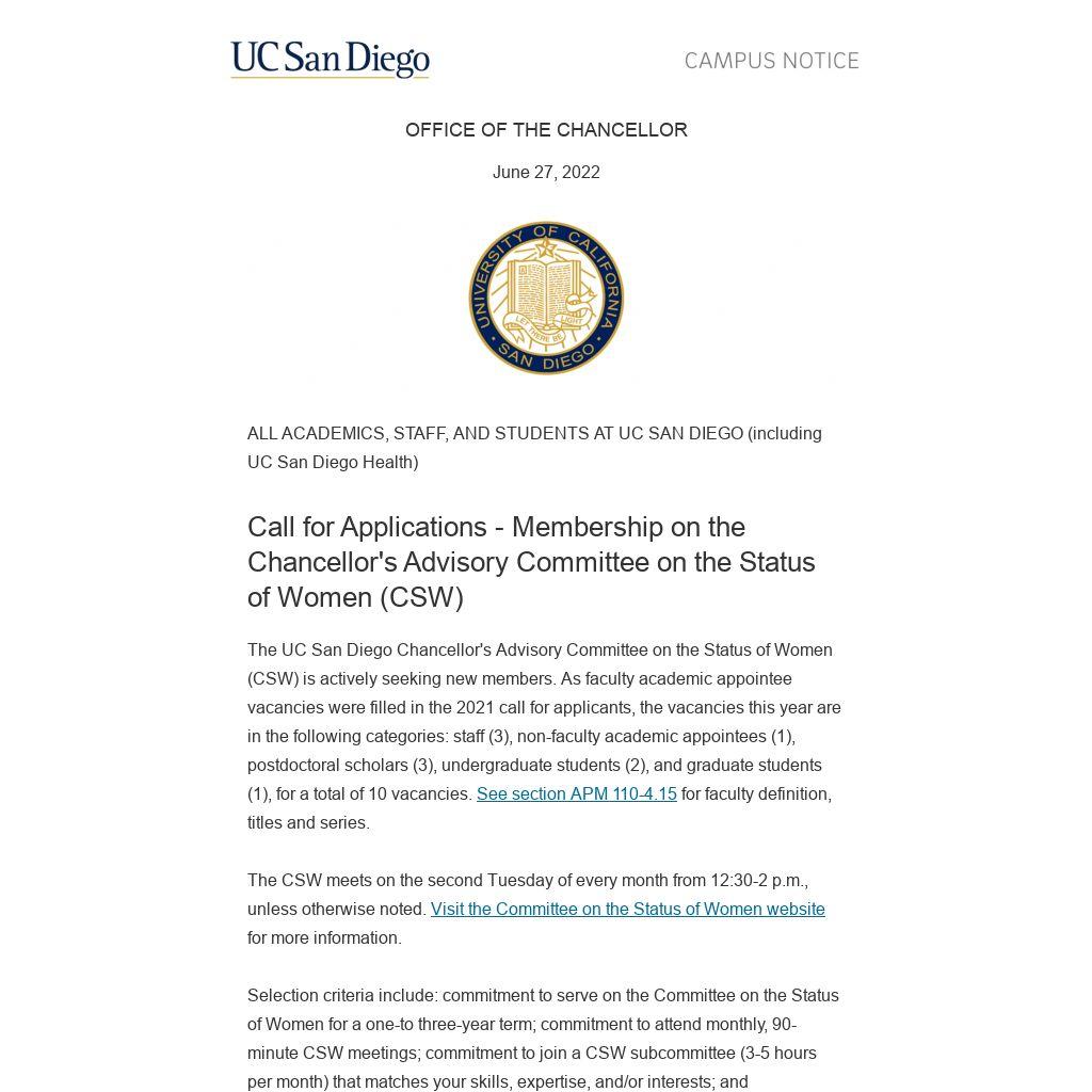 The UC San Diego Chancellor's Advisory Committee on the Status of Women (CSW) is actively seeking new members. As faculty academic appointee vacancies were filled in the 2021 call for applicants, the vacancies this year are in the following categories: staff (3), non-faculty academic appointees (1), postdoctoral scholars (3), undergraduate students (2), and graduate students (1), for a total of 10 vacancies. See section APM 110-4.15 for faculty definition, titles and series.