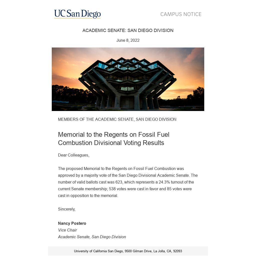The proposed Memorial to the Regents on Fossil Fuel Combustion was approved by a majority vote of the San Diego Divisional Academic Senate. The number of valid ballots cast was 623, which represents a 24.3% turnout of the current Senate membership; 538 votes were cast in favor and 85 votes were cast in opposition to the memorial.