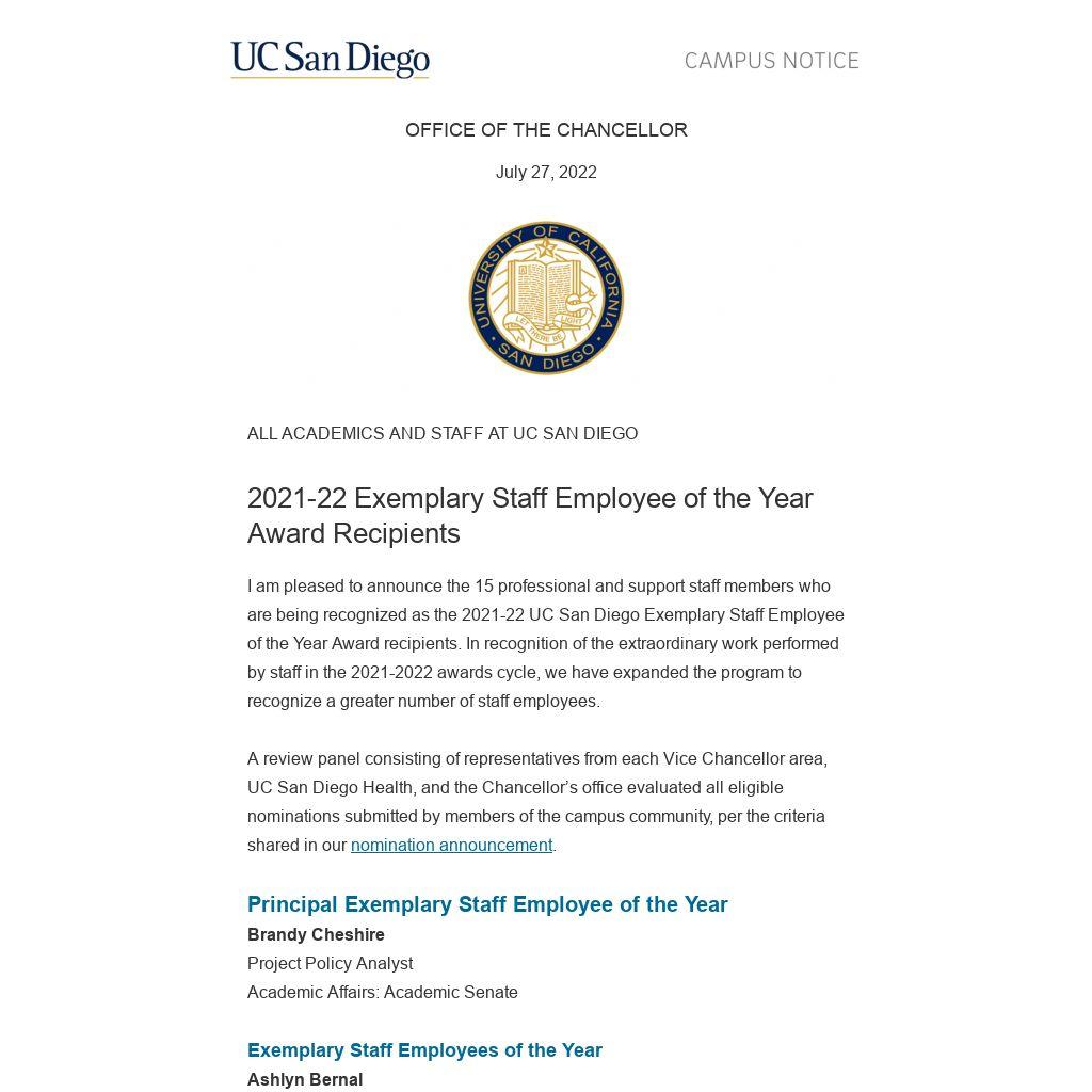 Exemplary Staff Employee of the Year Awards Program All members of the UC San Diego community are invited to join us as we recognize our award recipients at the virtual Exemplary Staff of the Year award program on Wednesday, August 25, 2022, at 3 p.m. Registration is not required. Use this link to join the event https://ucsd.zoom.us/j/92205469196 (webinar ID22546196; dial in (213)338477).