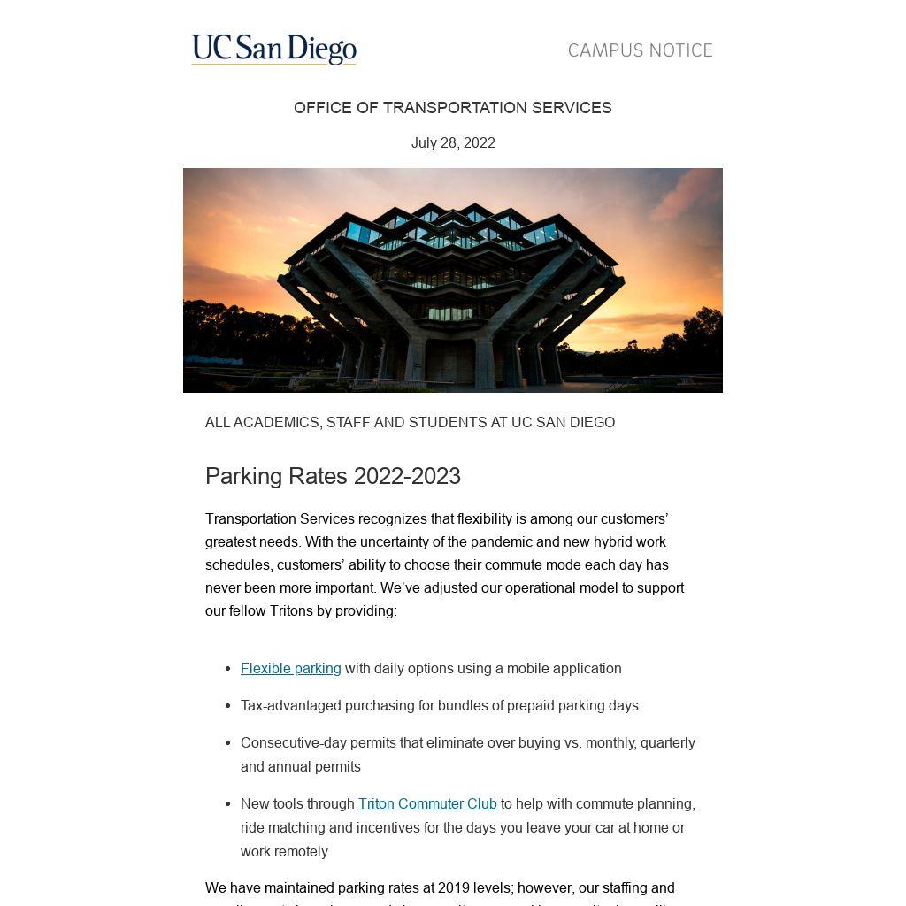 We have maintained parking rates at 2019 levels; however, our staffing and supplier costs have increased. As a result, many parking permit prices will increase for purchases made or billed after July 28, 2022, with a maximum increase of $0.45 per day for UC San Diego commuters and no rate increase for the D “Discount” permit or the Super Saver lots P782 and P386. Permit prices can be viewed on our website.