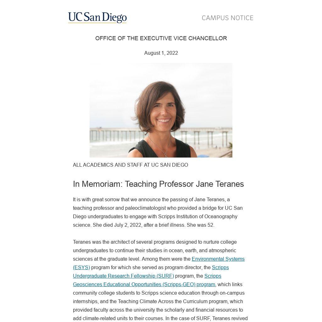 It is with great sorrow that we announce the passing of Jane Teranes, a teaching professor and paleoclimatologist who provided a bridge for UC San Diego undergraduates to engage with Scripps Institution of Oceanography science. She died July 2, 2022, after a brief illness. She was 52. Teranes was the architect of several programs designed to nurture college undergraduates to continue their studies in ocean, earth, and atmospheric sciences at the graduate level. Among them were the Environmental Systems (ESYS) program for which she served as program director, the Scripps Undergraduate Research Fellowship (SURF) program, the Scripps Geosciences Educational Opportunities (Scripps-GEO) program, which links community college students to Scripps science education through on-campus internships, and the Teaching Climate Across the Curriculum program, which provided faculty across the university the scholarly and financial resources to add climate-related units to their courses. In the case of SURF, Teranes revived Scripps’ participation in the National Science Foundation’s Research Experiences for Undergraduates (REU) program after a long absence. Teranes was born Nov. 10, 1969, in Detroit, Mich. and grew up in Grosse Pointe, Mich. She attended the Interlochen Center for the Arts in Interlochen, Mich. as a high school student before receiving a bachelor’s degree from Oberlin College in Ohio and finally a Ph.D. from Eidgenössische Technische Hochschule (ETH) in Zürich, Switzerland in 1998. She returned to the United States to serve as a postdoctoral researcher at the University of Michigan before coming to Scripps Oceanography as a postdoctoral researcher in the lab of geoscientist Chris Charles in November 1999. In 2003, Teranes was hired as associate director of ESYS, a newly launched environmental major at UC San Diego that was designed to be interdisciplinary, folding in expertise from departments across campus including chemistry, Scripps Oceanography, biology, economics, political science and engineering. Colleagues have called Teranes a “once-in-a-lifetime” type of person for her ability to interact with and guide students, many of whom have gone on to pursue cross-disciplinary careers ranging from SeaWorld to the U.S. Senate. Teranes went on to helm the ESYS program, overseeing its transition from management under the School of Physical Sciences to Scripps Oceanography in 2017. She also worked with colleagues across campus to create a new climate change studies minor, which debuted at Scripps during the 2019-20 academic year. The minor is designed to help students from any major develop knowledge of climate science, understand the human and social dimensions of climate impacts, and find opportunities to develop and implement solutions.