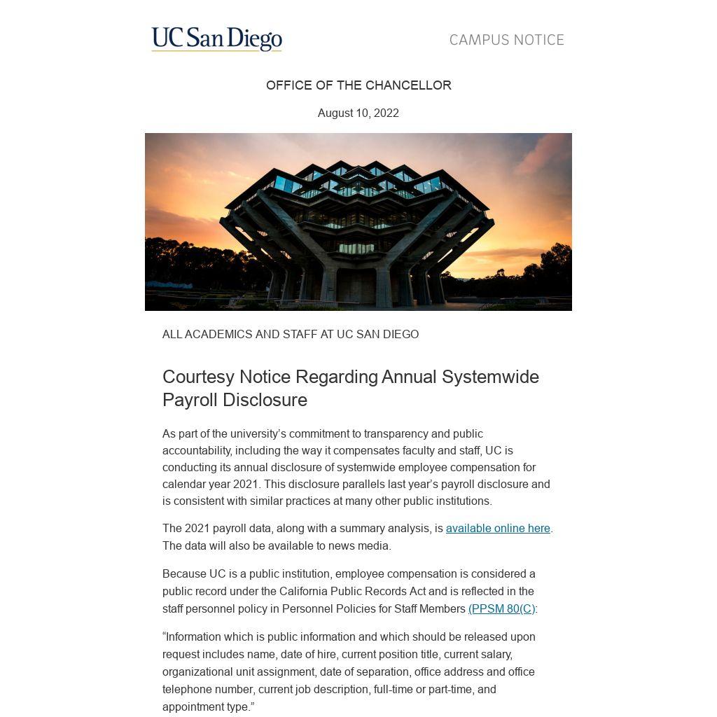 As part of the university’s commitment to transparency and public accountability, including the way it compensates faculty and staff, UC is conducting its annual disclosure of systemwide employee compensation for calendar year 2021. This disclosure parallels last year’s payroll disclosure and is consistent with similar practices at many other public institutions.