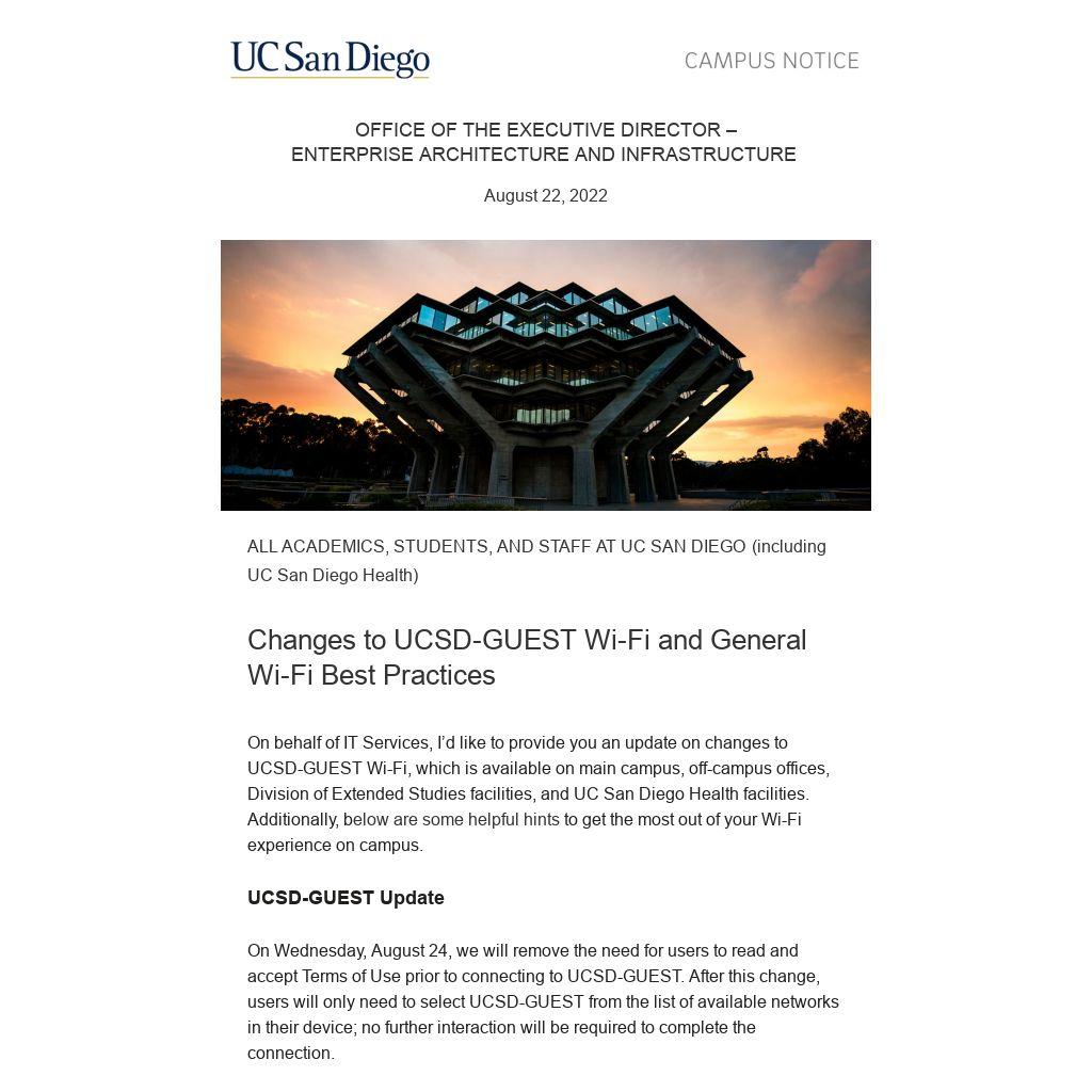 On behalf of IT Services, I’d like to provide you an update on changes to UCSD-GUEST Wi-Fi, which is available on main campus, off-campus offices, Division of Extended Studies facilities, and UC San Diego Health facilities. Additionally, below are some helpful hints to get the most out of your Wi-Fi experience on campus.