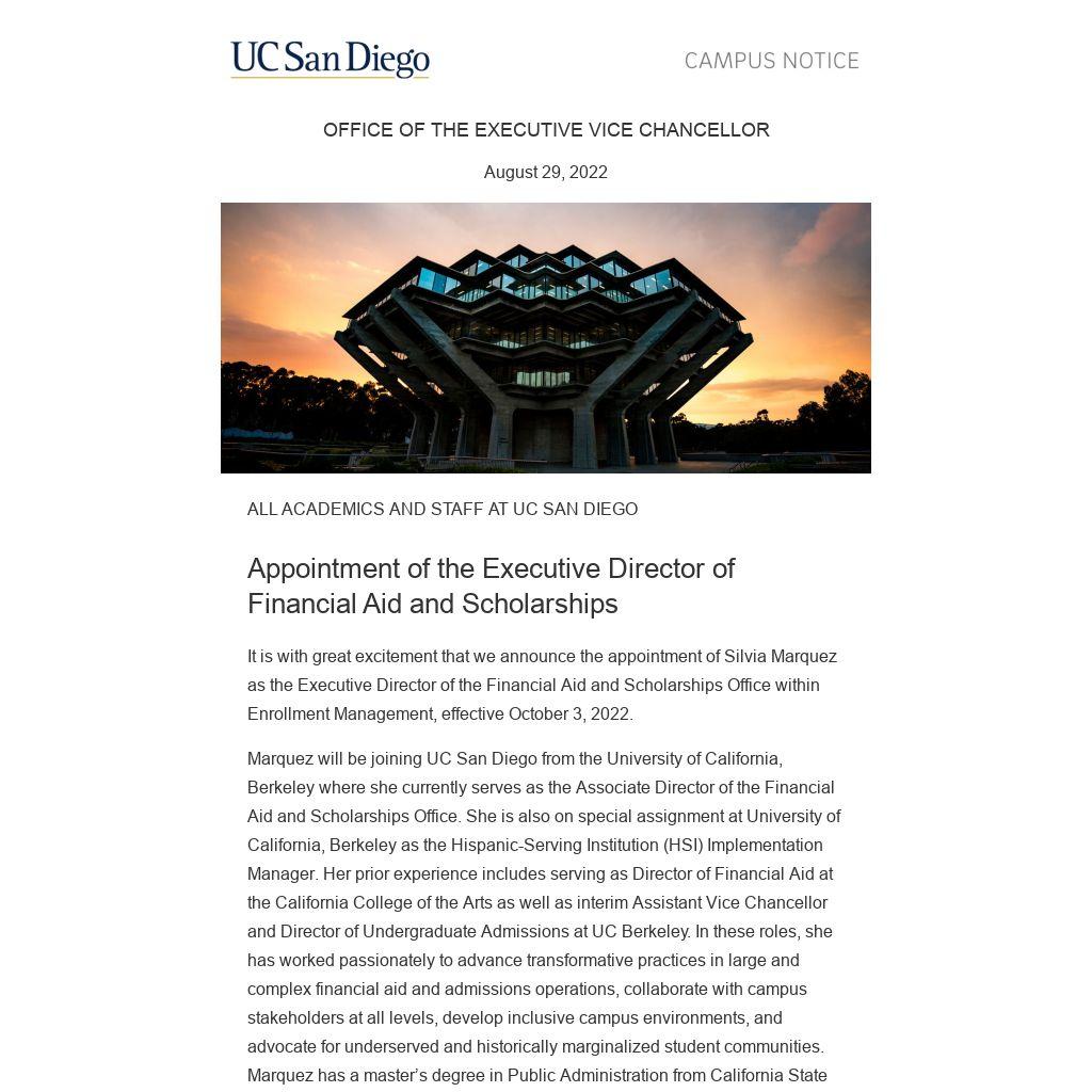 We also extend our sincere thanks and appreciation to Rosie Castaneda, who has been serving as Interim Director of the Financial Aid and Scholarships Office. Castaneda will remain in the role until Marquez’s arrival and will assist in her transition to UC San Diego.