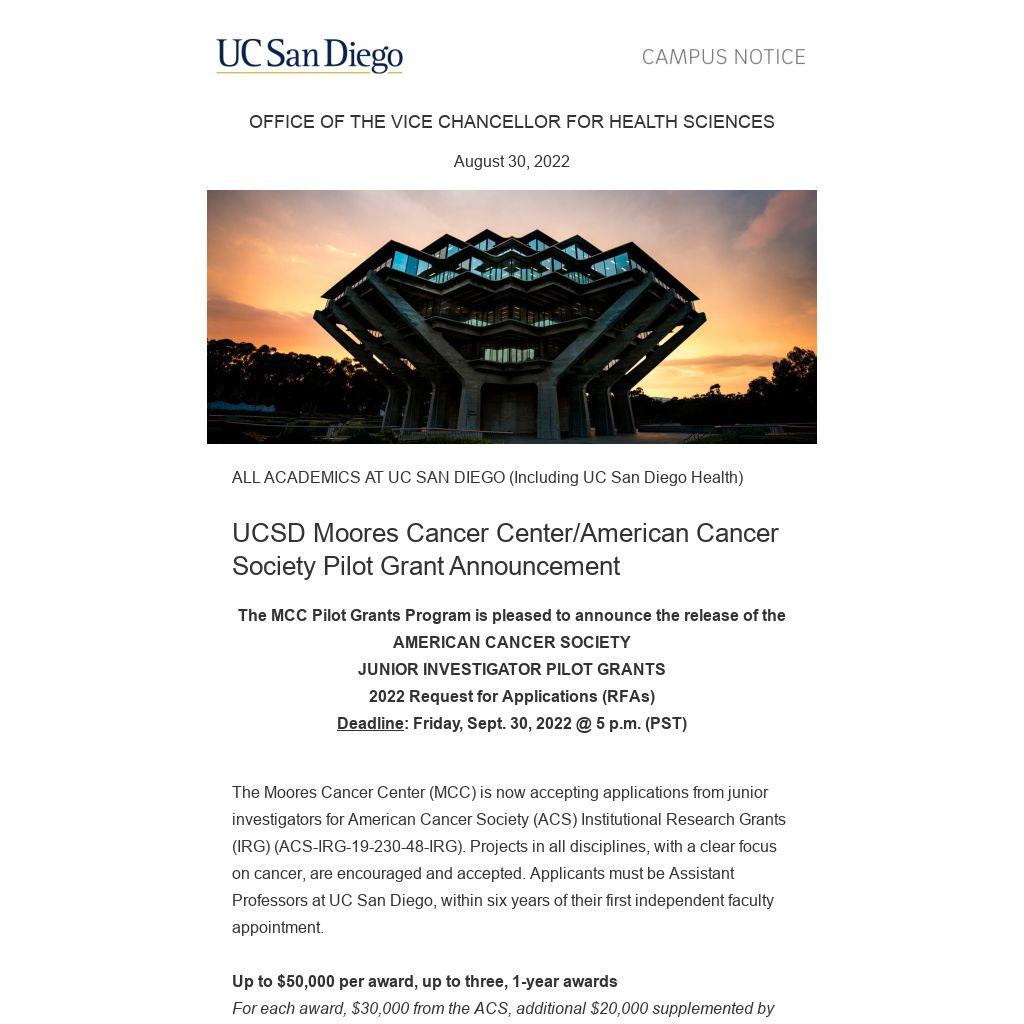 The Moores Cancer Center (MCC) is now accepting applications from junior investigators for American Cancer Society (ACS) Institutional Research Grants (IRG) (ACS-IRG-19-230-48-IRG). Projects in all disciplines, with a clear focus on cancer, are encouraged and accepted. Applicants must be Assistant Professors at UC San Diego, within six years of their first independent faculty appointment.