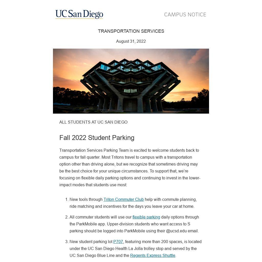 Transportation Services Parking Team is excited to welcome students back to campus for fall quarter. Most Tritons travel to campus with a transportation option other than driving alone, but we recognize that sometimes driving may be the best choice for your unique circumstances. To support that, we’re focusing on flexible daily parking options and continuing to invest in the lower-impact modes that students use most: