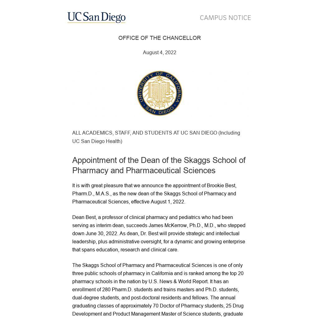 It is with great pleasure that we announce the appointment of Brookie Best, Pharm.D., M.A.S., as the new dean of the Skaggs School of Pharmacy and Pharmaceutical Sciences, effective August 1, 2022.