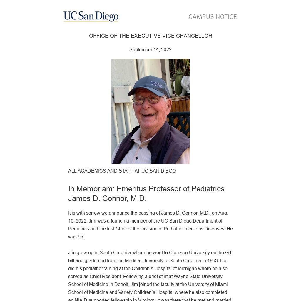 It is with sorrow we announce the passing of James D. Connor, M.D., on Aug. 10, 2022. Jim was a founding member of the UC San Diego Department of Pediatrics and the first Chief of the Division of Pediatric Infectious Diseases. He was 95.