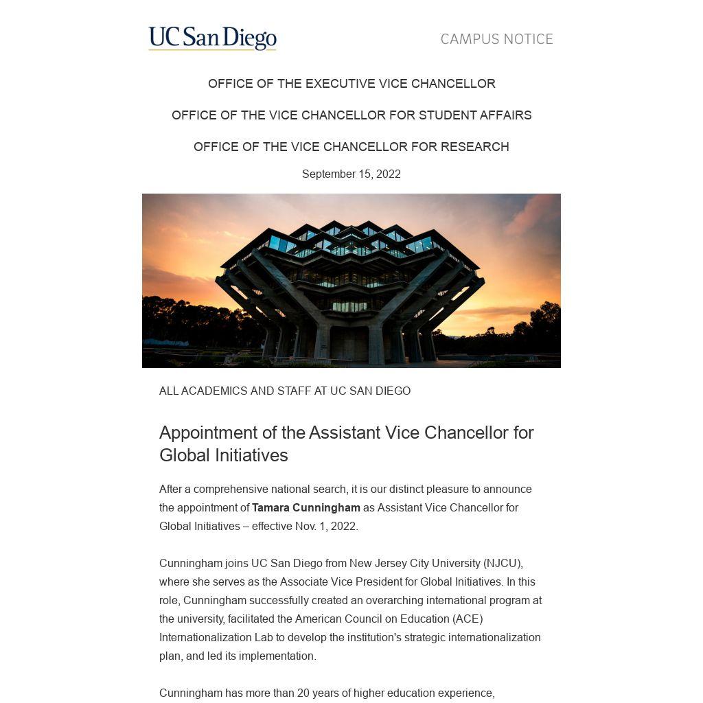 Please join us in congratulating Ms. Cunningham on her appointment. We are excited for her to bring her breadth of professional experience to our UC San Diego community.