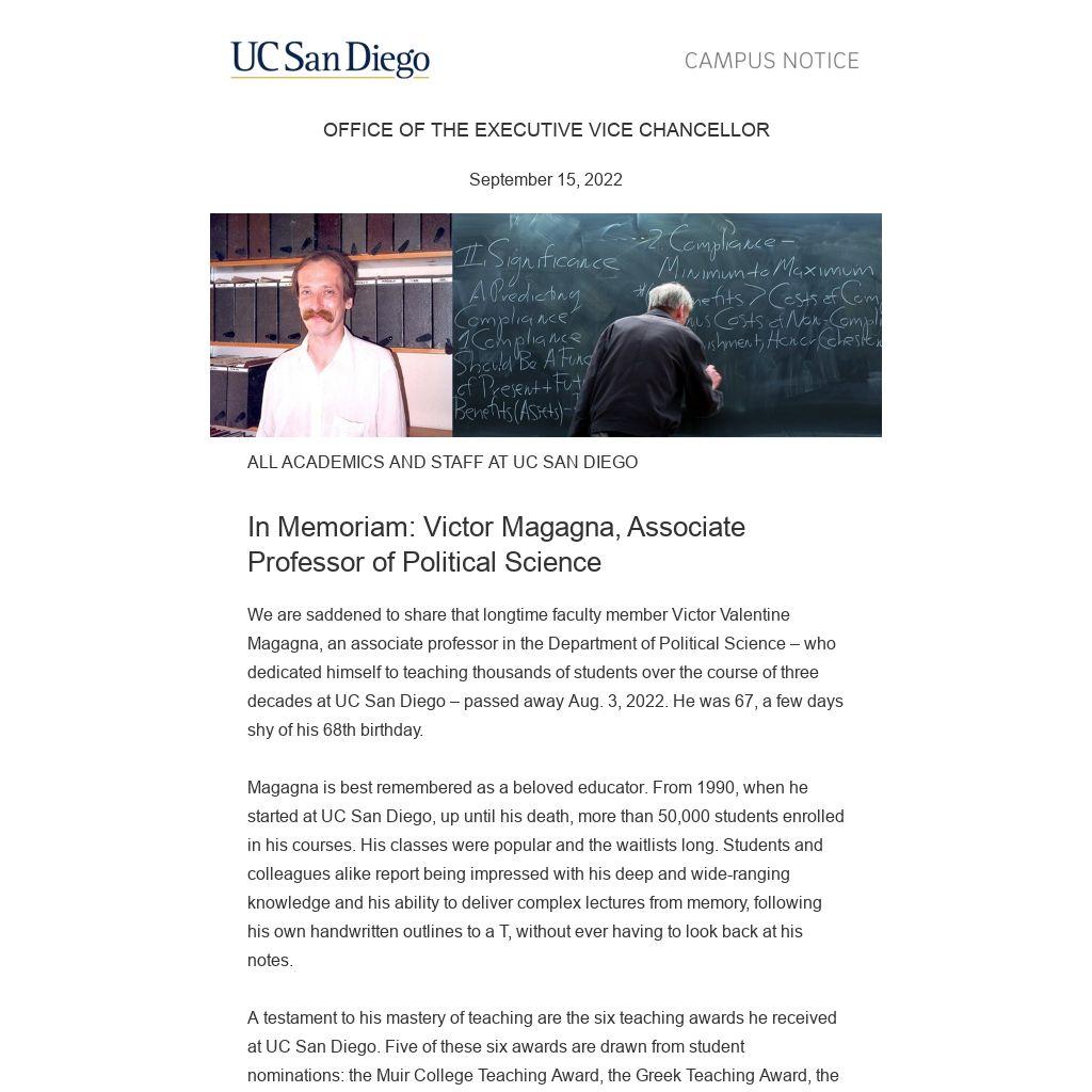 We are saddened to share that longtime faculty member Victor Valentine Magagna, an associate professor in the Department of Political Science – who dedicated himself to teaching thousands of students over the course of three decades at UC San Diego – passed away Aug. 3, 2022. He was 67, a few days shy of his 68th birthday.