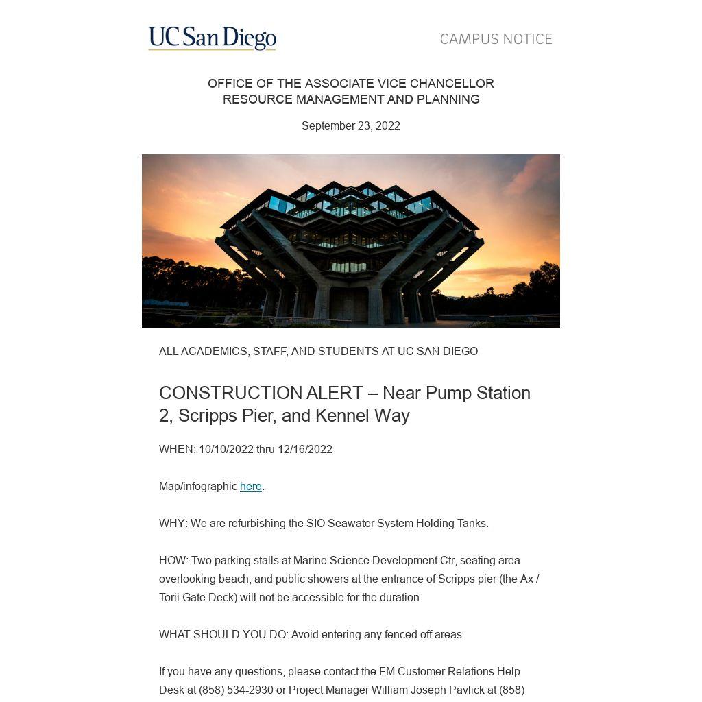 HOW: Two parking stalls at Marine Science Development Ctr, seating area overlooking beach, and public showers at the entrance of Scripps pier (the Ax / Torii Gate Deck) will not be accessible for the duration.