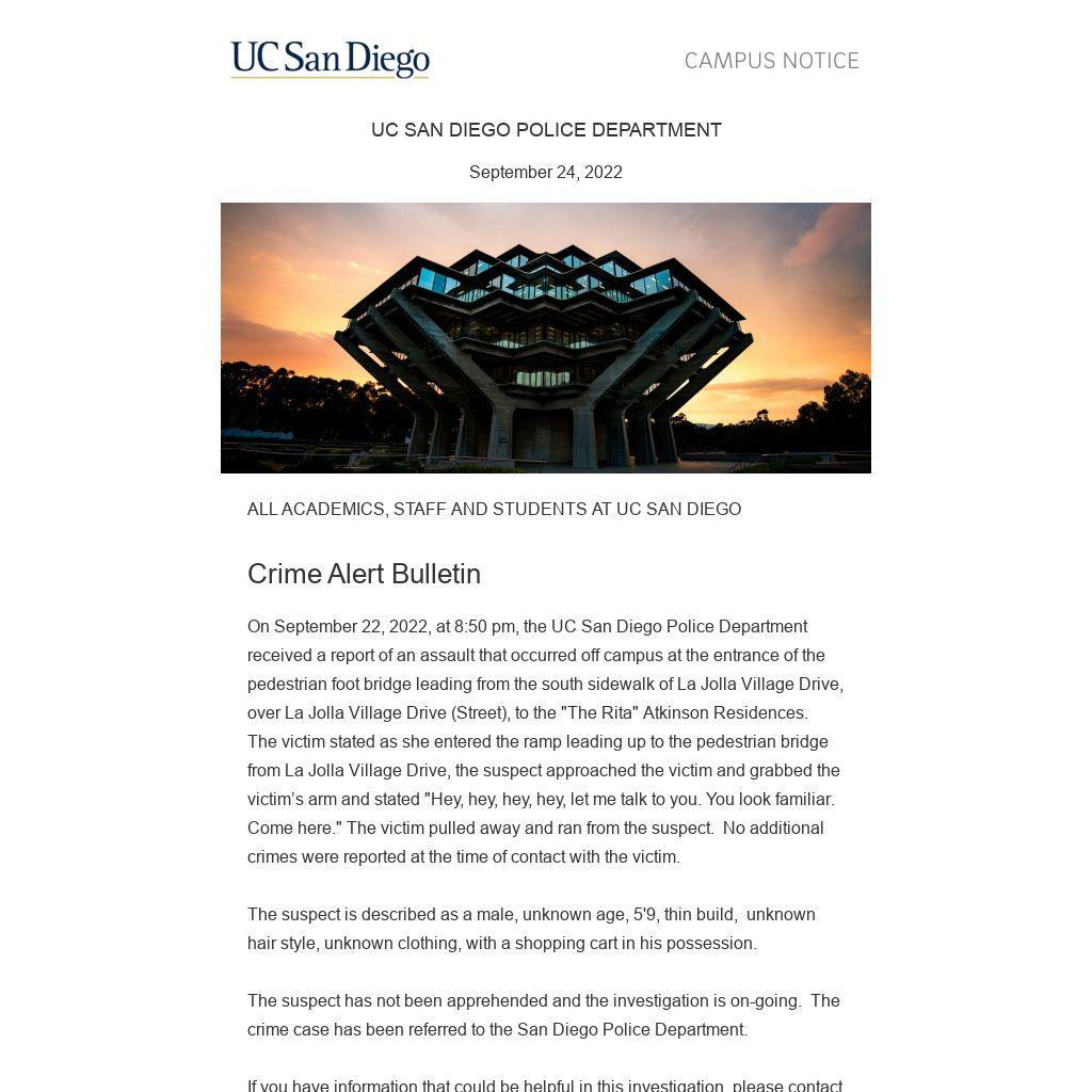 On September 22, 2022, at 8:50 pm, the UC San Diego Police Department received a report of an assault that occurred off campus at the entrance of the pedestrian foot bridge leading from the south sidewalk of La Jolla Village Drive, over La Jolla Village Drive (Street), to the "The Rita" Atkinson Residences. The victim stated as she entered the ramp leading up to the pedestrian bridge from La Jolla Village Drive, the suspect approached the victim and grabbed the victim’s arm and stated "Hey, hey, hey, hey, let me talk to you. You look familiar. Come here." The victim pulled away and ran from the suspect. No additional crimes were reported at the time of contact with the victim.