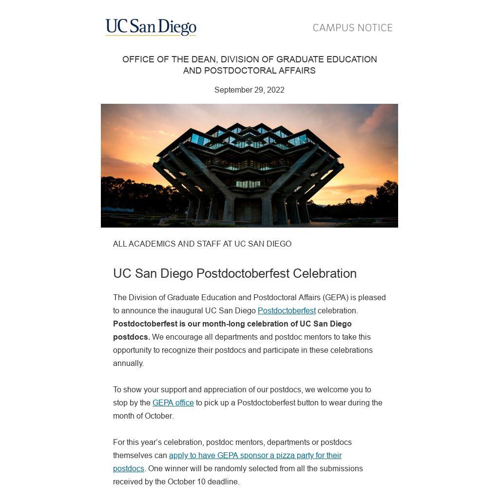 We also encourage the submissions of notes or images recognizing UCSD postdocs to the Postdoctoral Association’s Postdoctoberfest Jamboard. Two of the UCSD postdocs who receive shout outs will be randomly selected to receive $50 gift cards.
