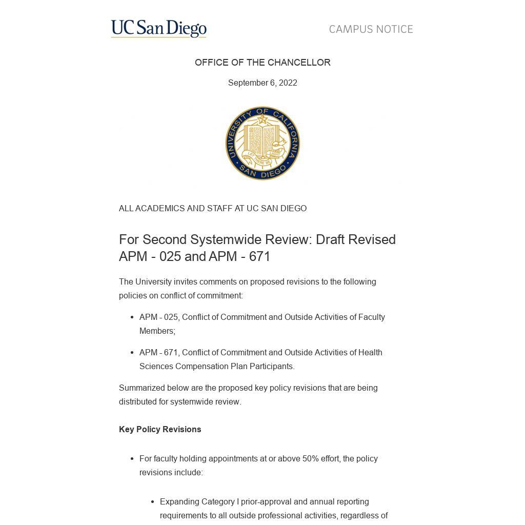 The above proposed revisions to the conflict-of-commitment policies of APM - 025 and APM - 671 are posted to the Academic Personnel and Programs website under the “Systemwide Review” tab. It may also be viewed here.
