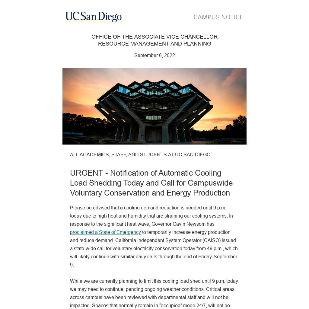 High power demand will put a strain on both the State’s electric system and the SDG&E regional grid. While our microgrid system that extends from east campus to Scripps Institution of Oceanography protects the campus from grid instability, we are taking measures to minimize campus energy consumption during this time.