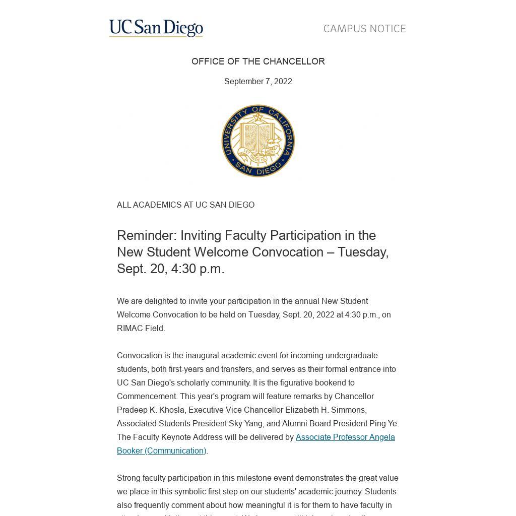 Convocation is the inaugural academic event for incoming undergraduate students, both first-years and transfers, and serves as their formal entrance into UC San Diego's scholarly community. It is the figurative bookend to Commencement. This year's program will feature remarks by Chancellor Pradeep K. Khosla, Executive Vice Chancellor Elizabeth H. Simmons, Associated Students President Sky Yang, and Alumni Board President Ping Ye. The Faculty Keynote Address will be delivered by Associate Professor Angela Booker (Communication).