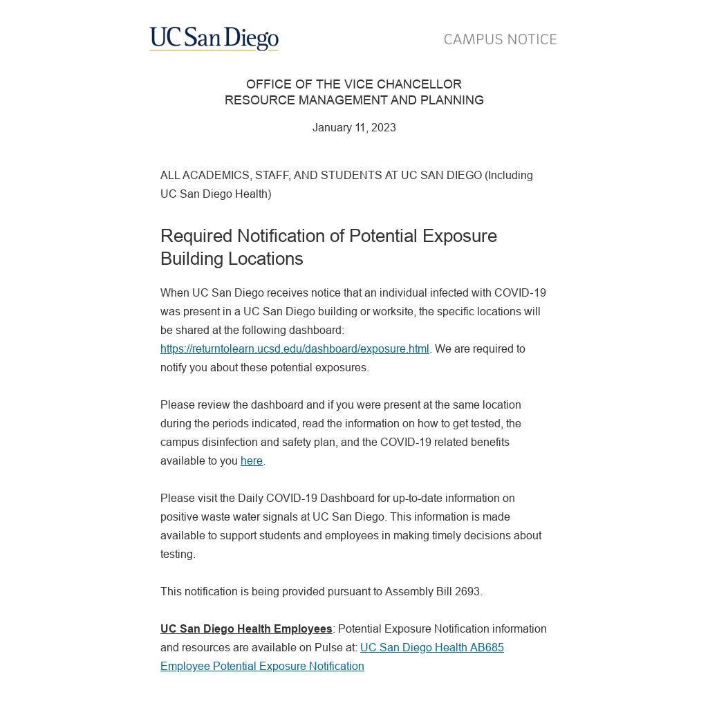 When UC San Diego receives notice that an individual infected with COVID‐19 was present in a UC San Diego building or worksite, the specific locations will be shared at the following dashboard: https://returntolearn.ucsd.edu/dashboard/exposure.html. We are required to notify you about these potential exposures.