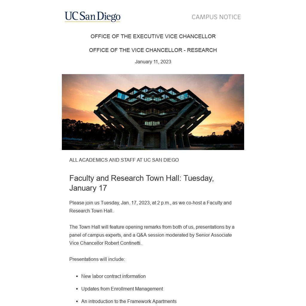 The Town Hall will feature opening remarks from both of us, presentations by a panel of campus experts, and a Q&A session moderated by Senior Associate Vice Chancellor Robert Continetti.