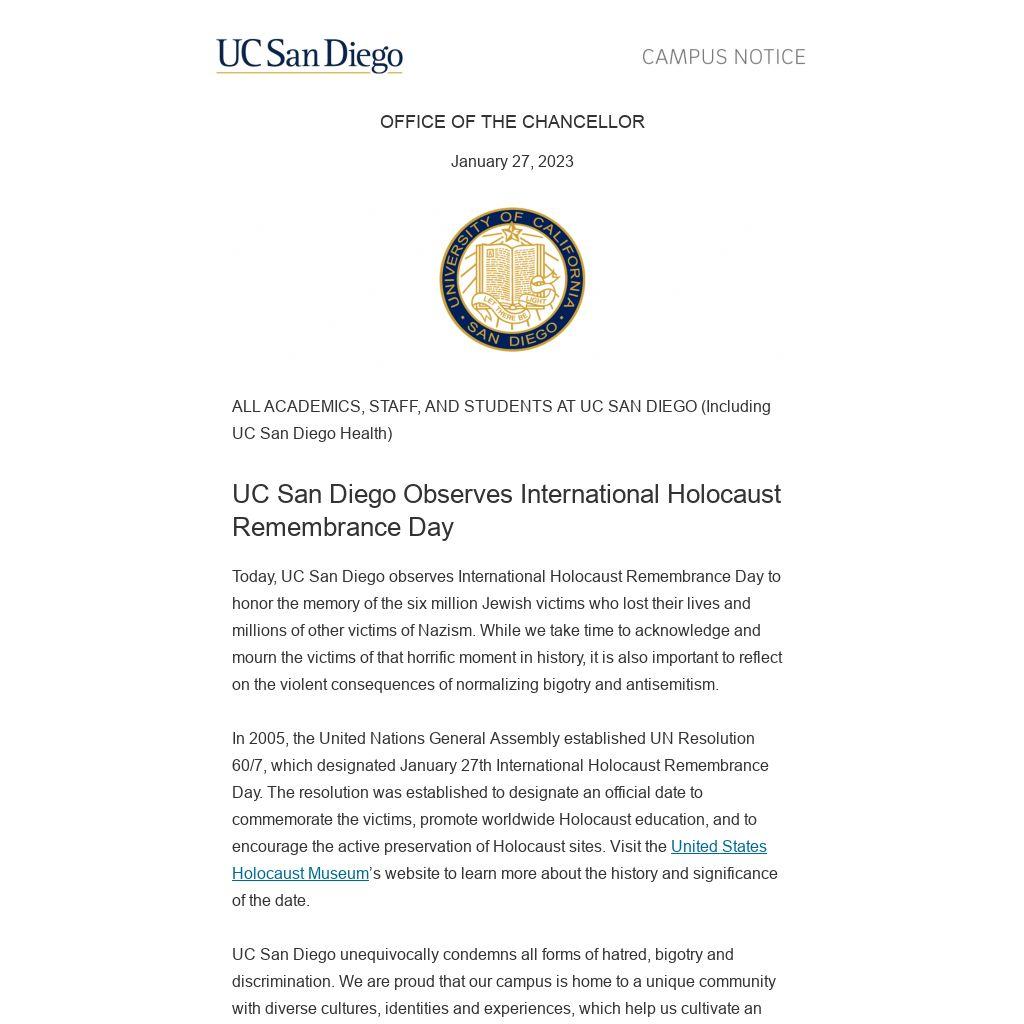 Today, UC San Diego observes International Holocaust Remembrance Day to honor the memory of the six million Jewish victims who lost their lives and millions of other victims of Nazism. While we take time to acknowledge and mourn the victims of that horrific moment in history, it is also important to reflect on the violent consequences of normalizing bigotry and antisemitism.