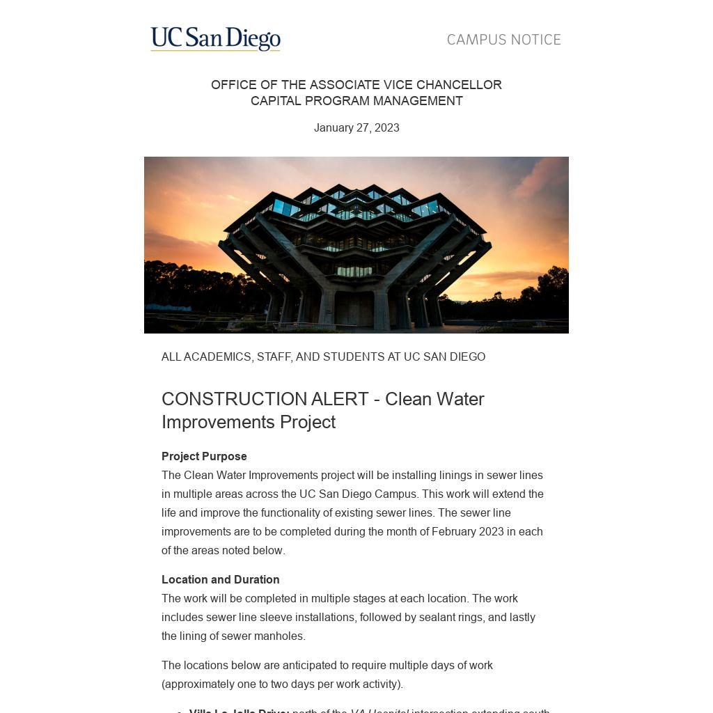 The Clean Water Improvements project will be installing linings in sewer lines in multiple areas across the UC San Diego Campus. This work will extend the life and improve the functionality of existing sewer lines. The sewer line improvements are to be completed during the month of February 2023 in each of the areas noted below.