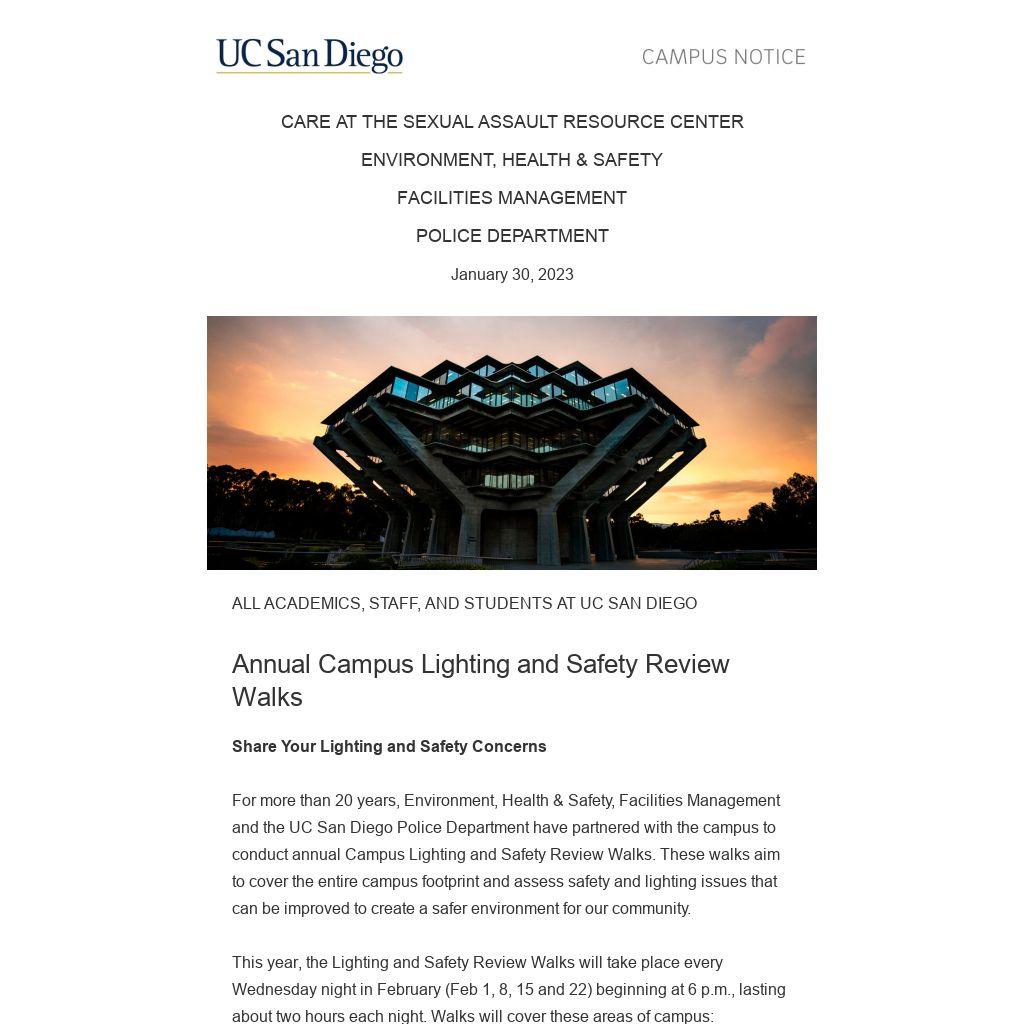 For more than 20 years, Environment, Health & Safety, Facilities Management and the UC San Diego Police Department have partnered with the campus to conduct annual Campus Lighting and Safety Review Walks. These walks aim to cover the entire campus footprint and assess safety and lighting issues that can be improved to create a safer environment for our community.