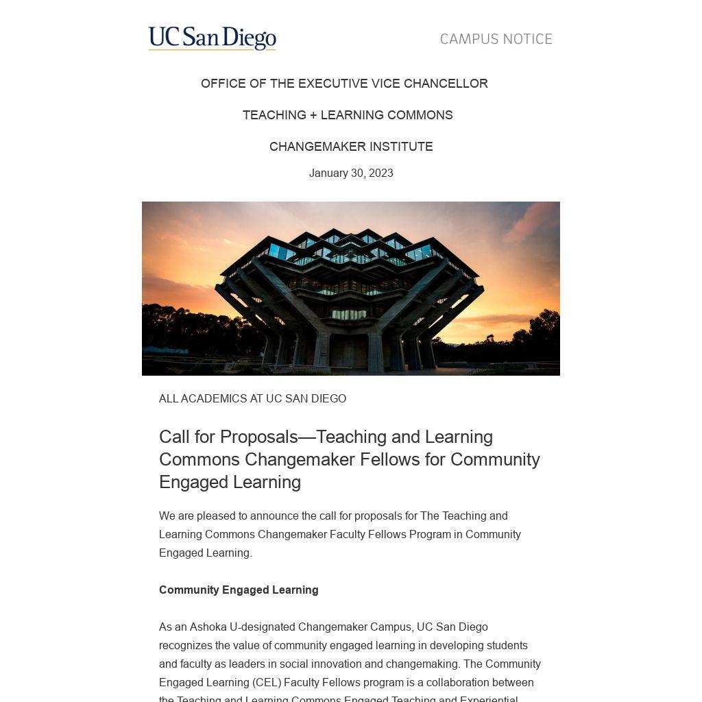As an Ashoka U-designated Changemaker Campus, UC San Diego recognizes the value of community engaged learning in developing students and faculty as leaders in social innovation and changemaking. The Community Engaged Learning (CEL) Faculty Fellows program is a collaboration between the Teaching and Learning Commons Engaged Teaching and Experiential Learning Hubs, with support from the Changemaker Institute and Faculty Leadership and Development.