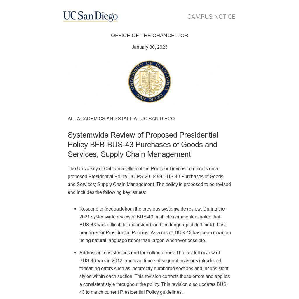 The University of California Office of the President invites comments on a proposed Presidential Policy UC-PS-20-0489-BUS-43 Purchases of Goods and Services; Supply Chain Management. The policy is proposed to be revised and includes the following key issues: