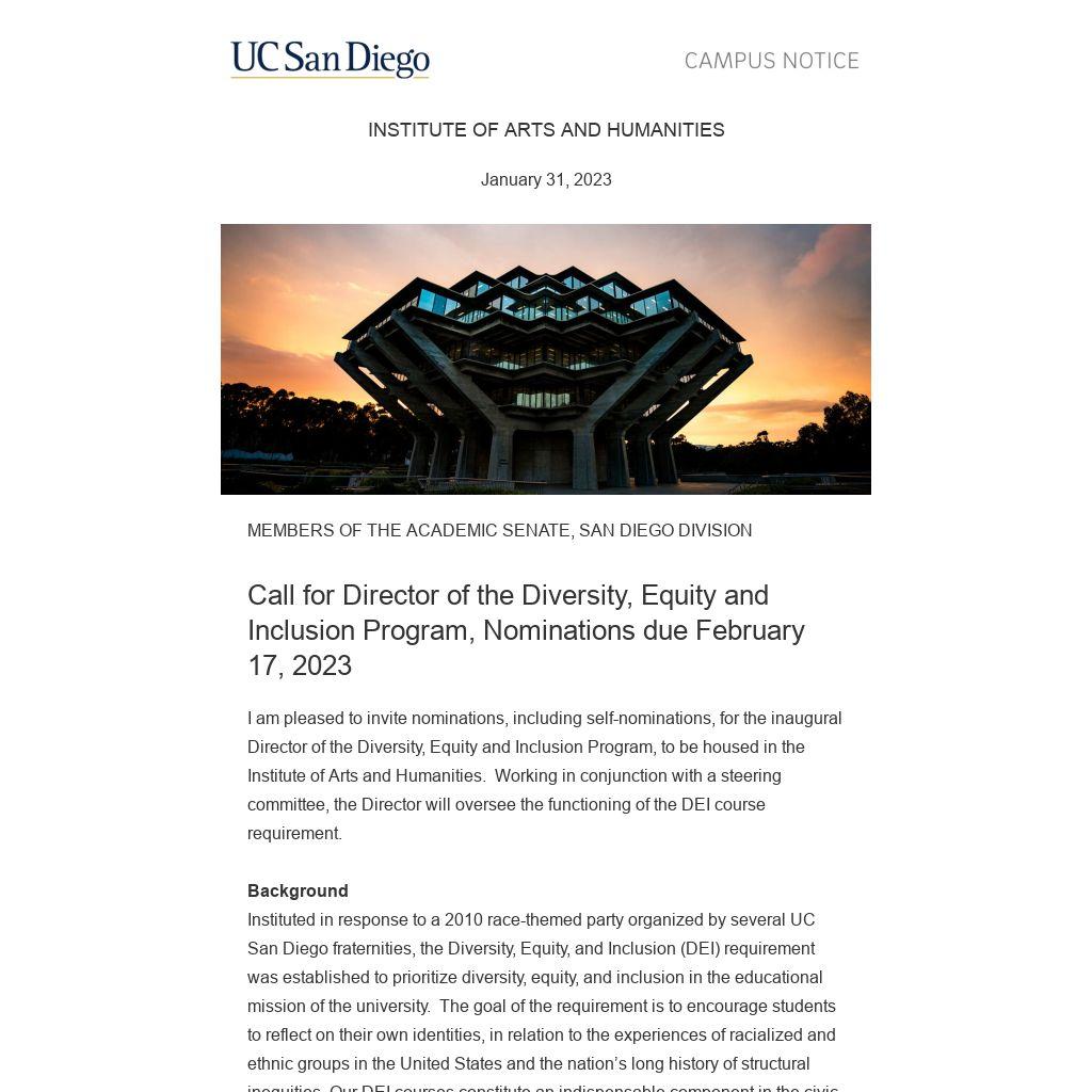 I am pleased to invite nominations, including self-nominations, for the inaugural Director of the Diversity, Equity and Inclusion Program, to be housed in the Institute of Arts and Humanities. Working in conjunction with a steering committee, the Director will oversee the functioning of the DEI course requirement.