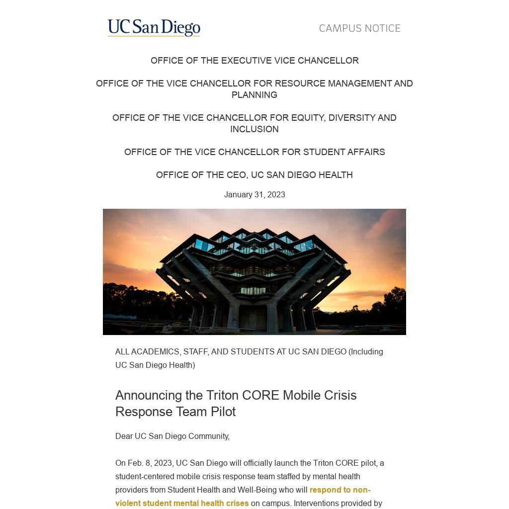 On Feb. 8, 2023, UC San Diego will officially launch the Triton CORE pilot, a student-centered mobile crisis response team staffed by mental health providers from Student Health and Well-Being who will respond to non-violent student mental health crises on campus. Interventions provided by this team will be grounded in equity, social justice, and compassionate, trauma-informed care.