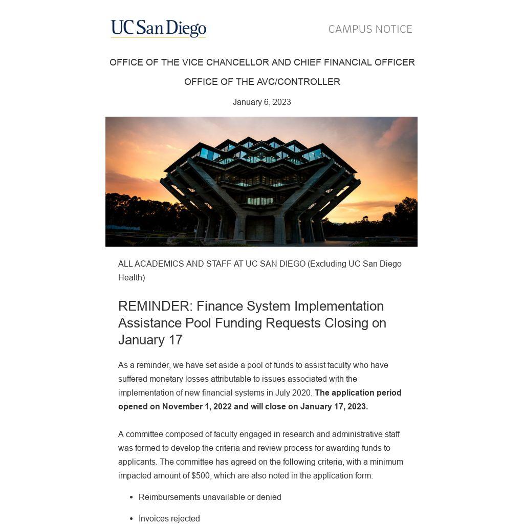 As a reminder, we have set aside a pool of funds to assist faculty who have suffered monetary losses attributable to issues associated with the implementation of new financial systems in July 2020. The application period opened on November 1, 2022 and will close on January 17, 2023.