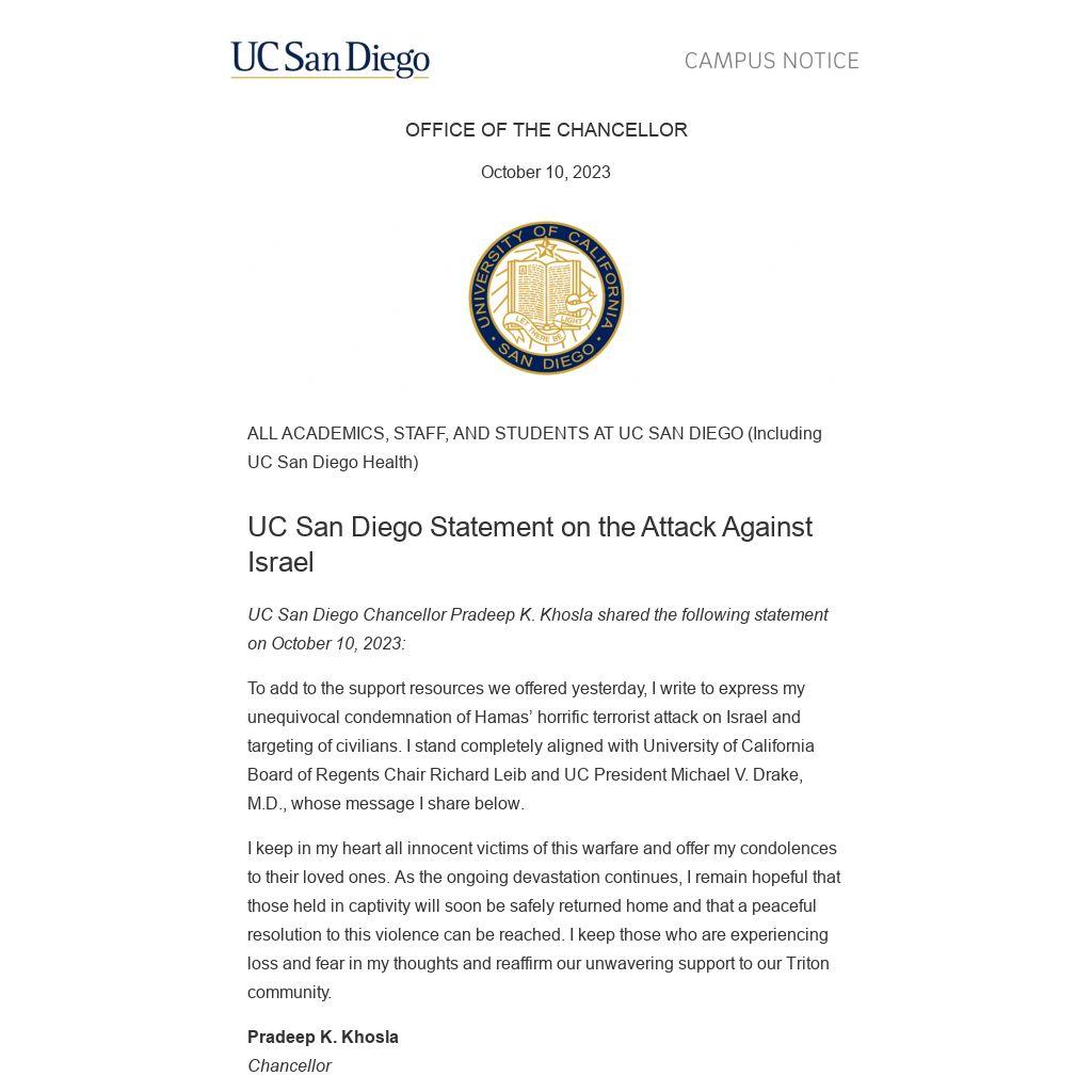 University of California Board of Regents Chair Richard Leib and UC President Michael V. Drake, M.D., shared the following statement on Monday, Oct. 9, 2023, in the wake of a violent weekend in the Middle East: