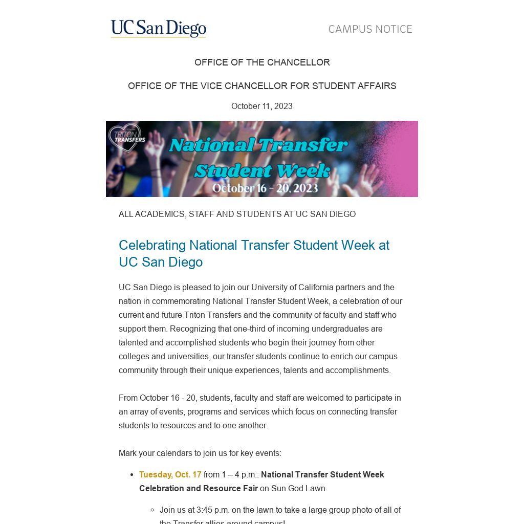 We wish to thank the UC San Diego community for your continued support in advancing the success of our transfer students. To learn more about National Transfer Student Week and transfer support on campus, please visit Transfer Student Success.